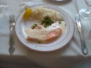 お昼ごはんはボルシチと鮭のムニエルにバターライス添えたもの、
