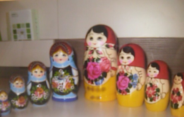 素朴な顔から、まつ毛ふさふさの濃いお顔、わざとぶちゃいく(ぶちゃ可愛い)もの、高価?なものは大きくで、おなかの部分に風景がかかれていたり、童話の場面が描かれていたり。大きいのから小さいのを出すたびにお話しが進んでいっているのかな?みんな、お顔が違います!