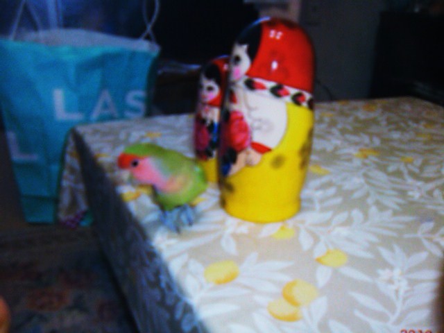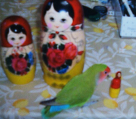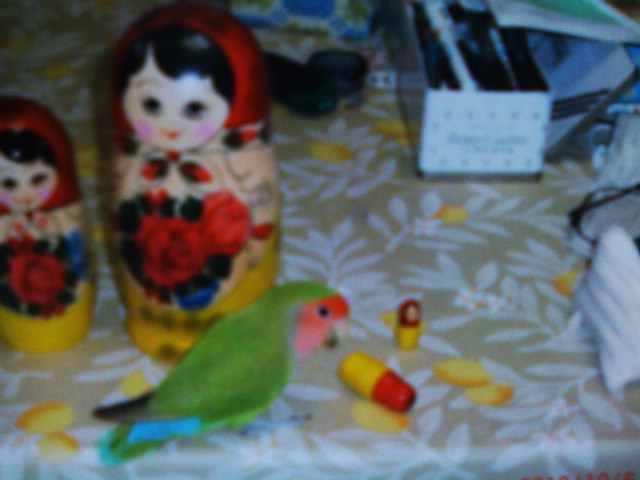 これを迷ちゃんを肩に乗せ、一体、一体おなかを開けながら披露しておりますと、小さい人形が出てくると、鳥、手を伝って移動やおら、攻撃!!!さすが鳥!勝てる相手にだけケンカ売るわ、わかりやすいやっちゃ。よしよし。